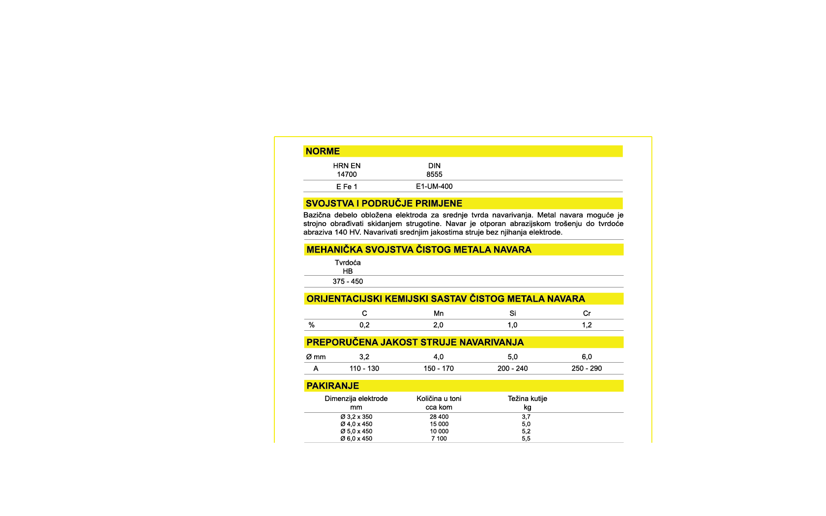 Bazična debelo oblozena elektroda za srednje tvrda navarivanja. Metal navara moguće je strojno obradjivati skidanjem strugotine. Navar je otporan abrazijskom trošenju do tvrdoće abraziva 140 HV.