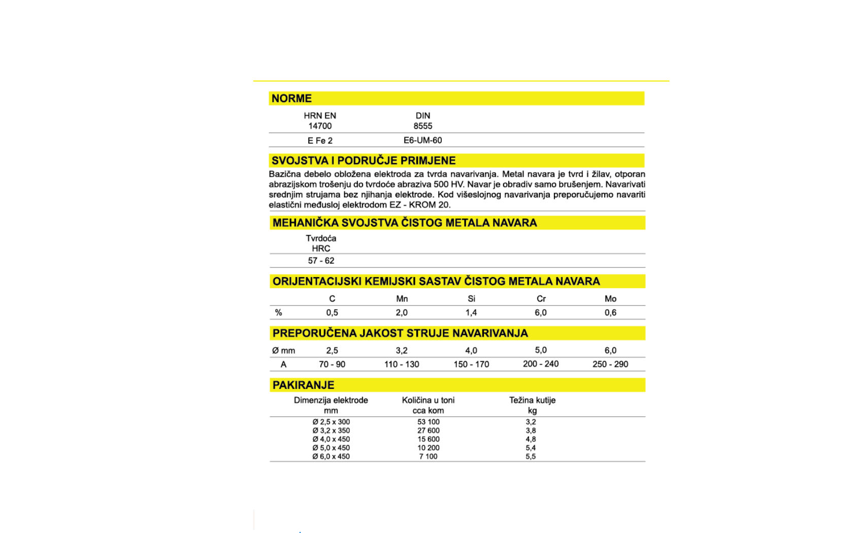Bazična debelo obložena elektroda za tvrda navarivanja. Metal navara je tvrd i žilav, otporan